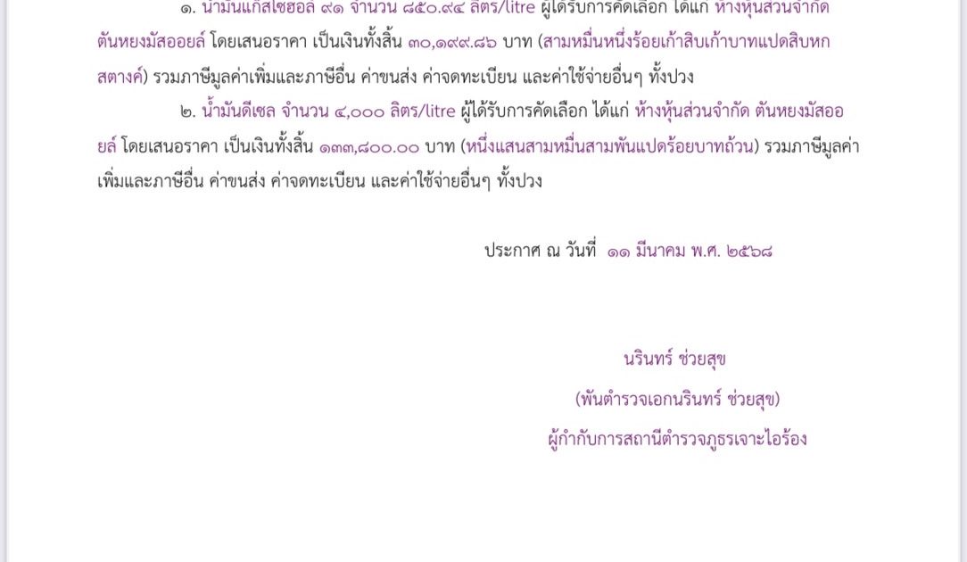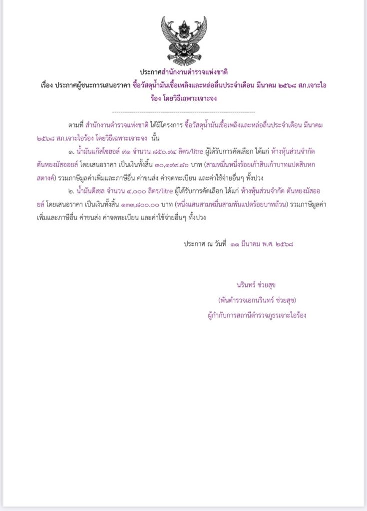 Home » ข่าวประชาสัมพันธ์ » ไม่มีหมวดหมู่ » ประกาศ จัดซื้อ น้ำมัน เดือน มีนาคม ๖๘