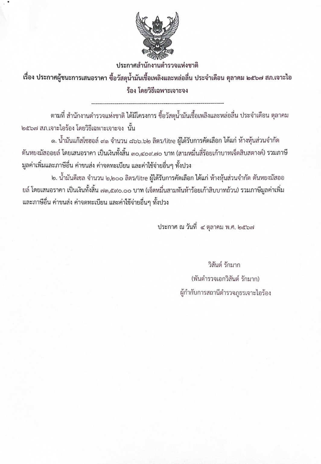 จัดซื้อน้ำมัน เดือน ตุลาคม ๖๗